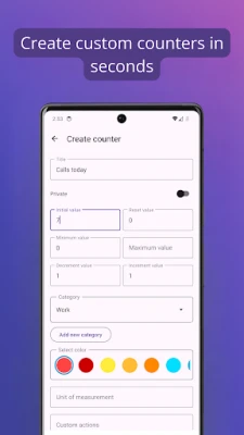 Personalize each counter with a name, category, initial value, increment/decrement step, min/max limits, color, unit of measurement, quick actions, and more.
