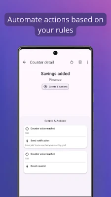 Set up custom events (e.g., "value reaches 100", "multiple of 5", "maximum exceeded") and link them to automatic actions (e.g., "reset the counter", "increase another counter", "change color", "double the value").